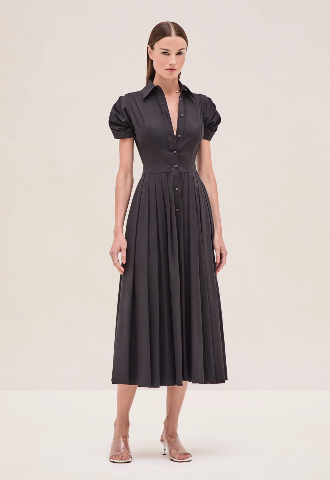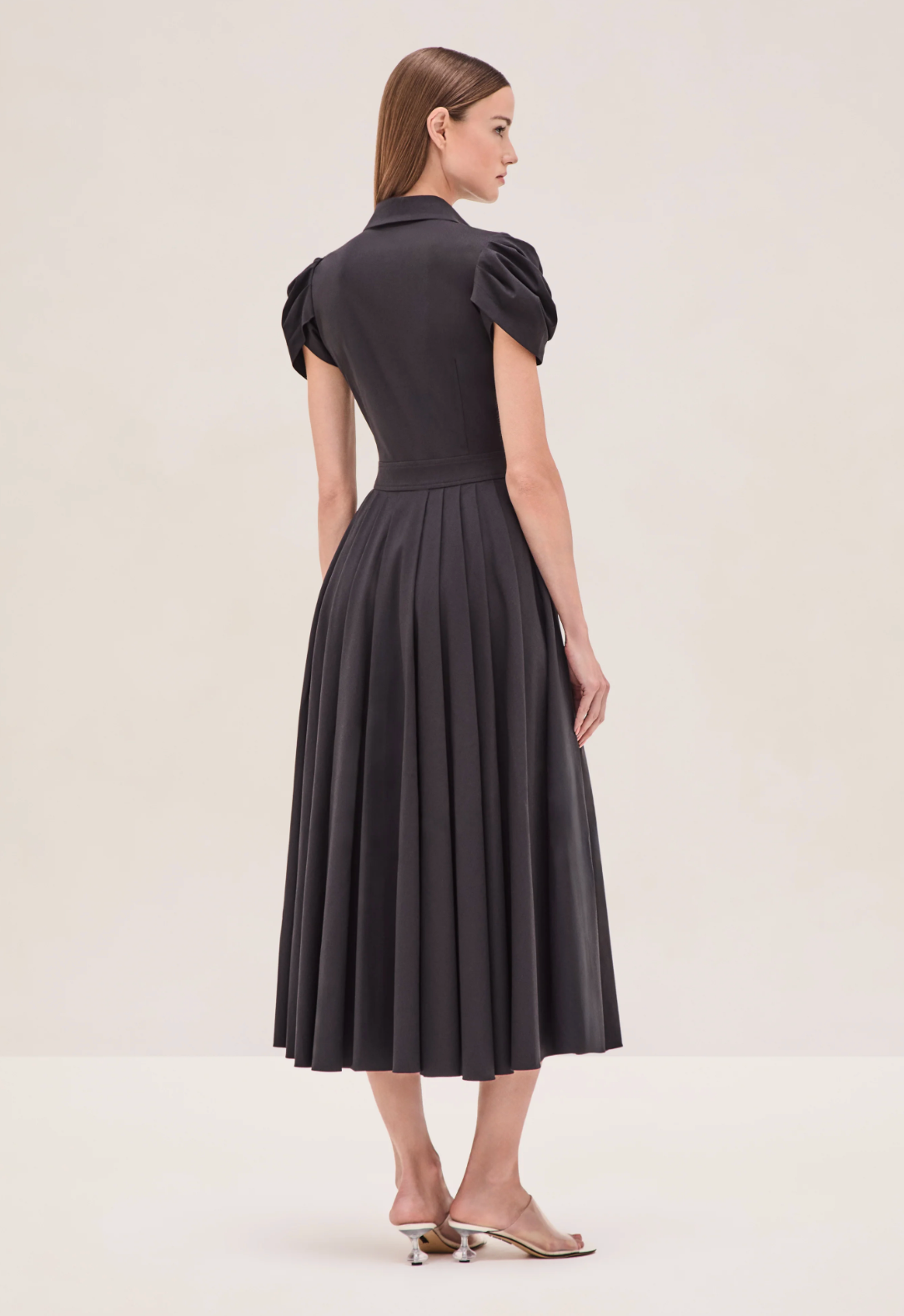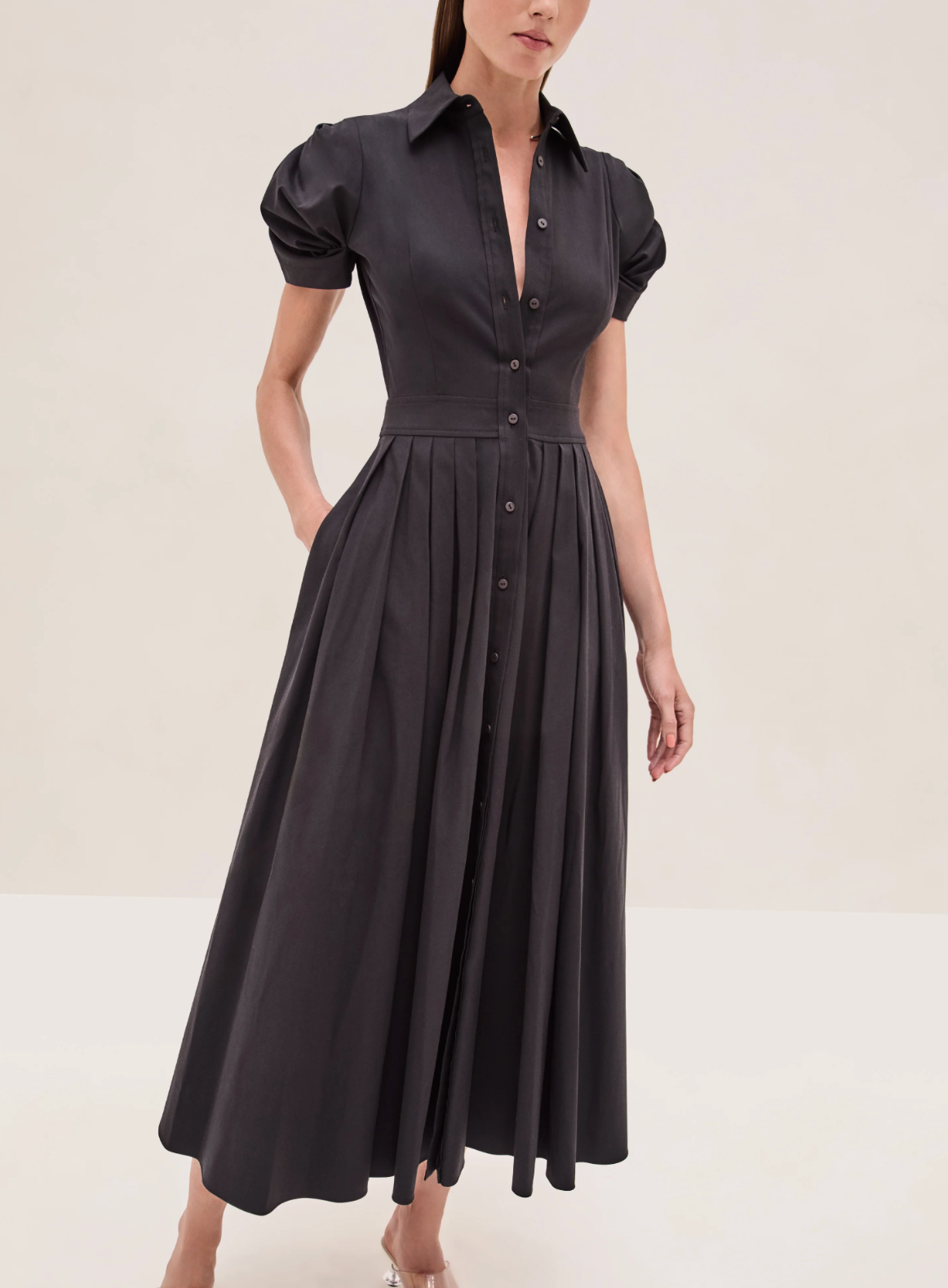 The Gyles Dress is a cotton poplin midi featuring a structured shirt collar. button-down front. and soft pleating.