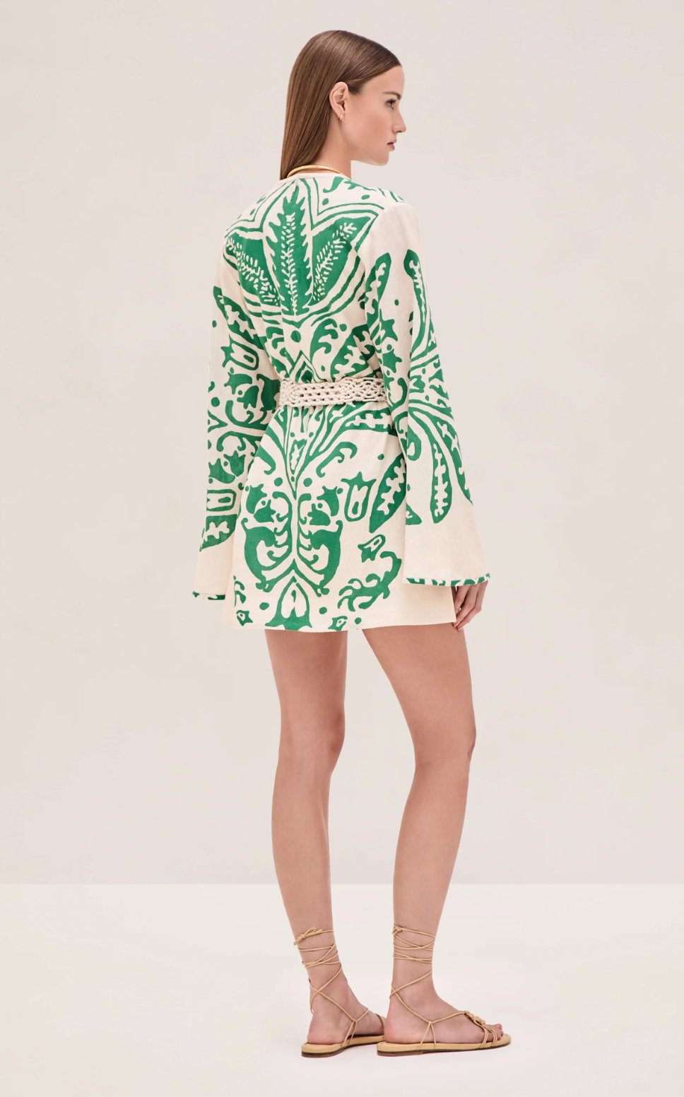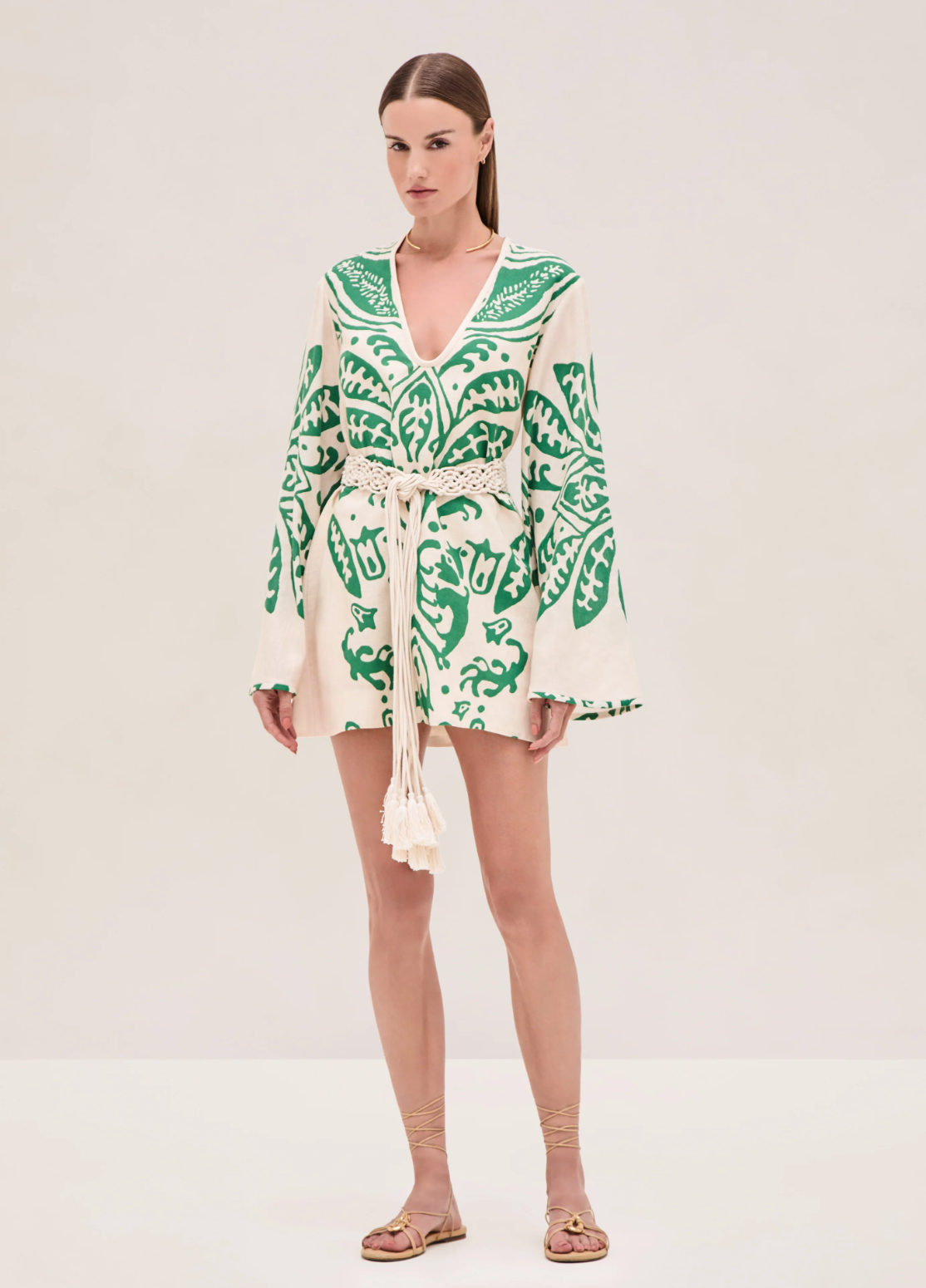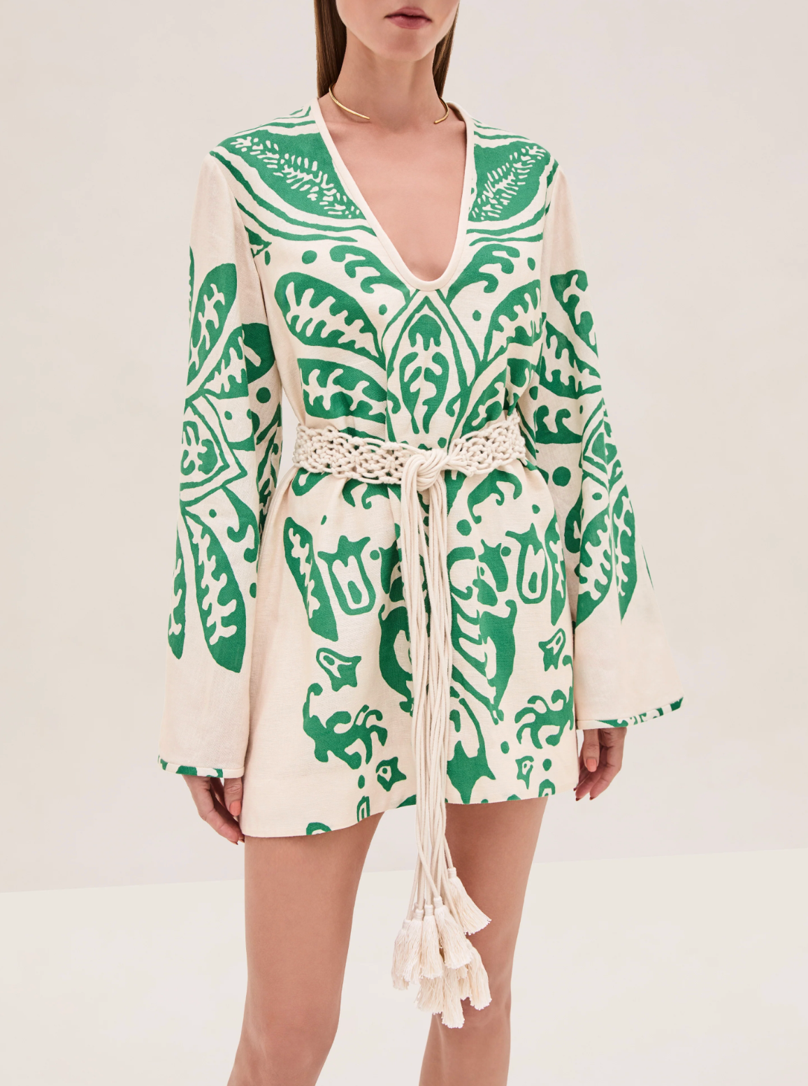 The Noriko Dress is a cotton-linen blend tunic dress featuring a removable macrame belt.