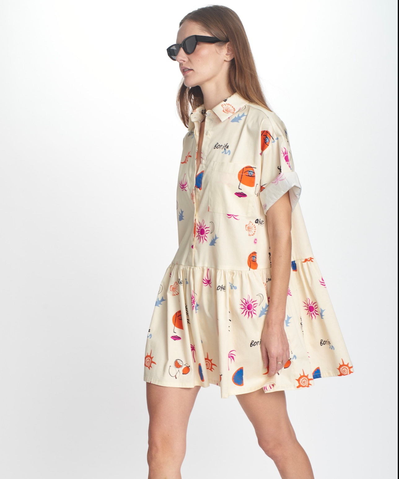 Cotton easy fit dress with drop waist. cuffed loose sleeve with summertime sketch print. Runs big.