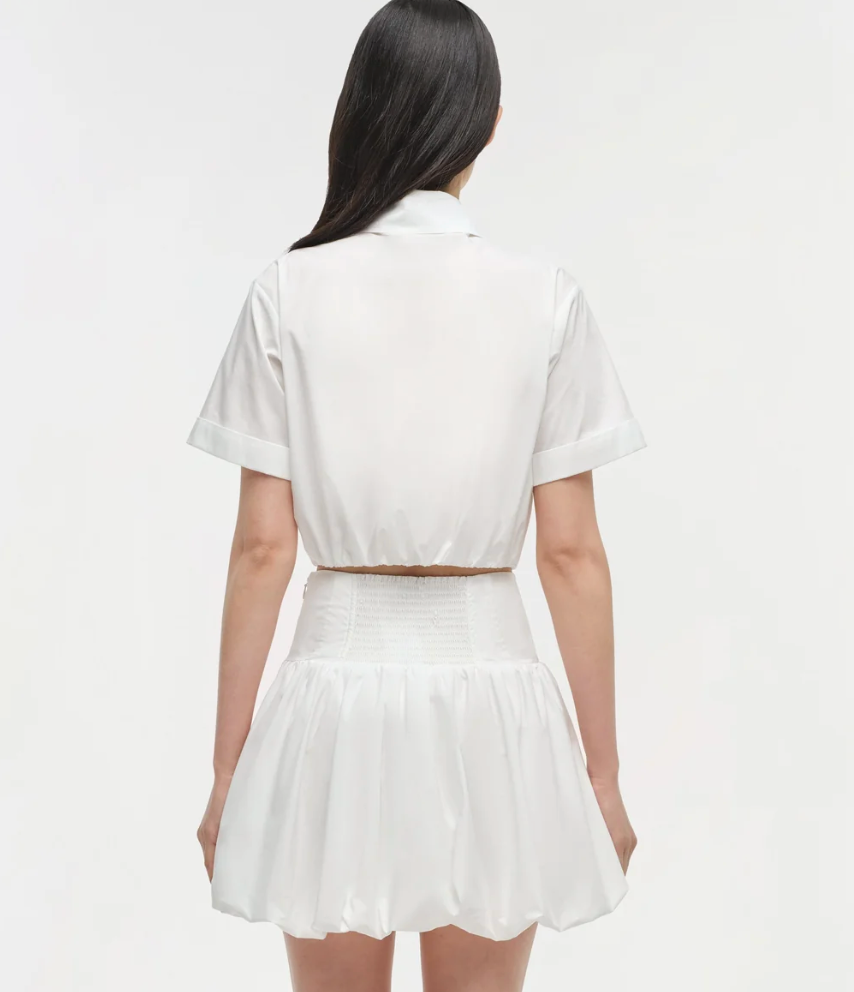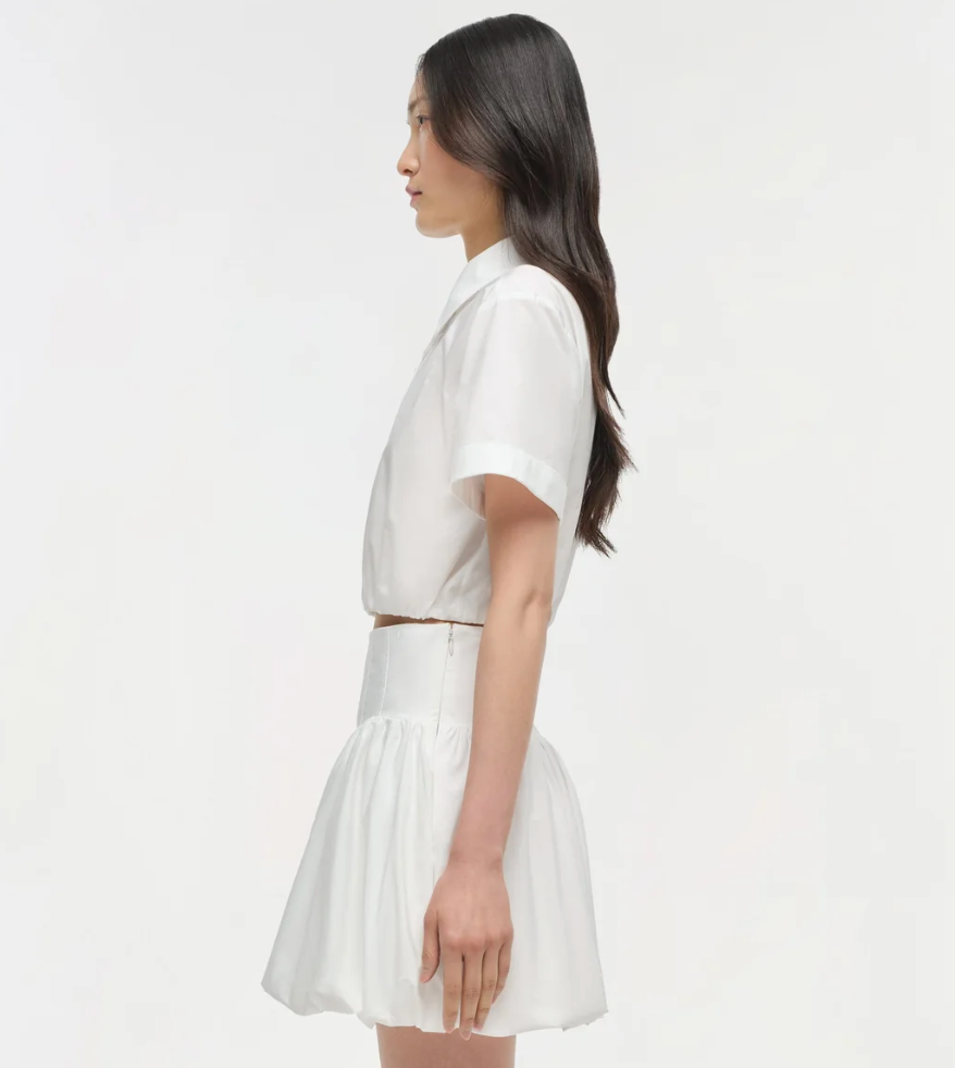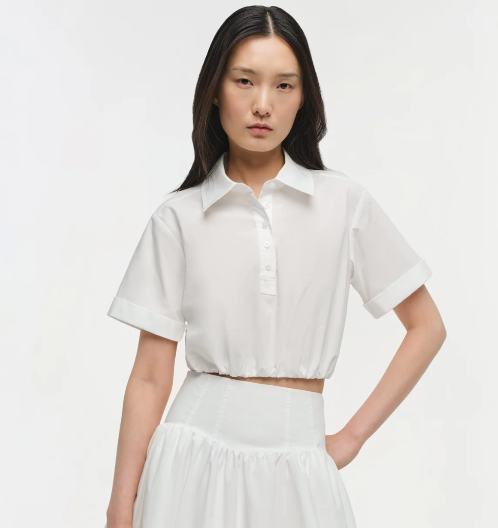 Crisp cropped cotton poplin short sleeve shirt with 1/2 button front. Perfect for very high waited bottoms.